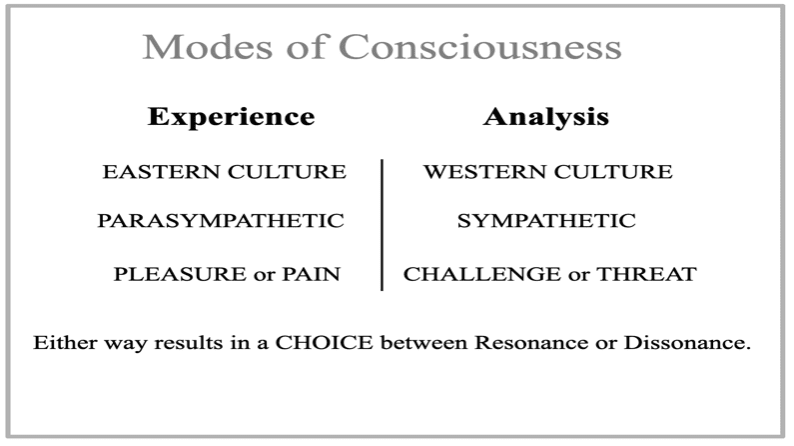 Electroencephalography (EEG) has become an accepted way of measuring the status and function of the ANS. The diagram below is an expanded version of the standard model and shows how the perception of choice versus threat directs consciousness into resonance or dissonance, whether or not one is speeding up into the sympathetic system or slowing down into the parasympathetic mode.